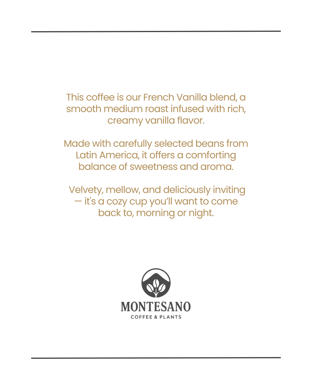 A smooth medium roast infused with rich French vanilla flavor — mellow, aromatic, and made to warm your soul.